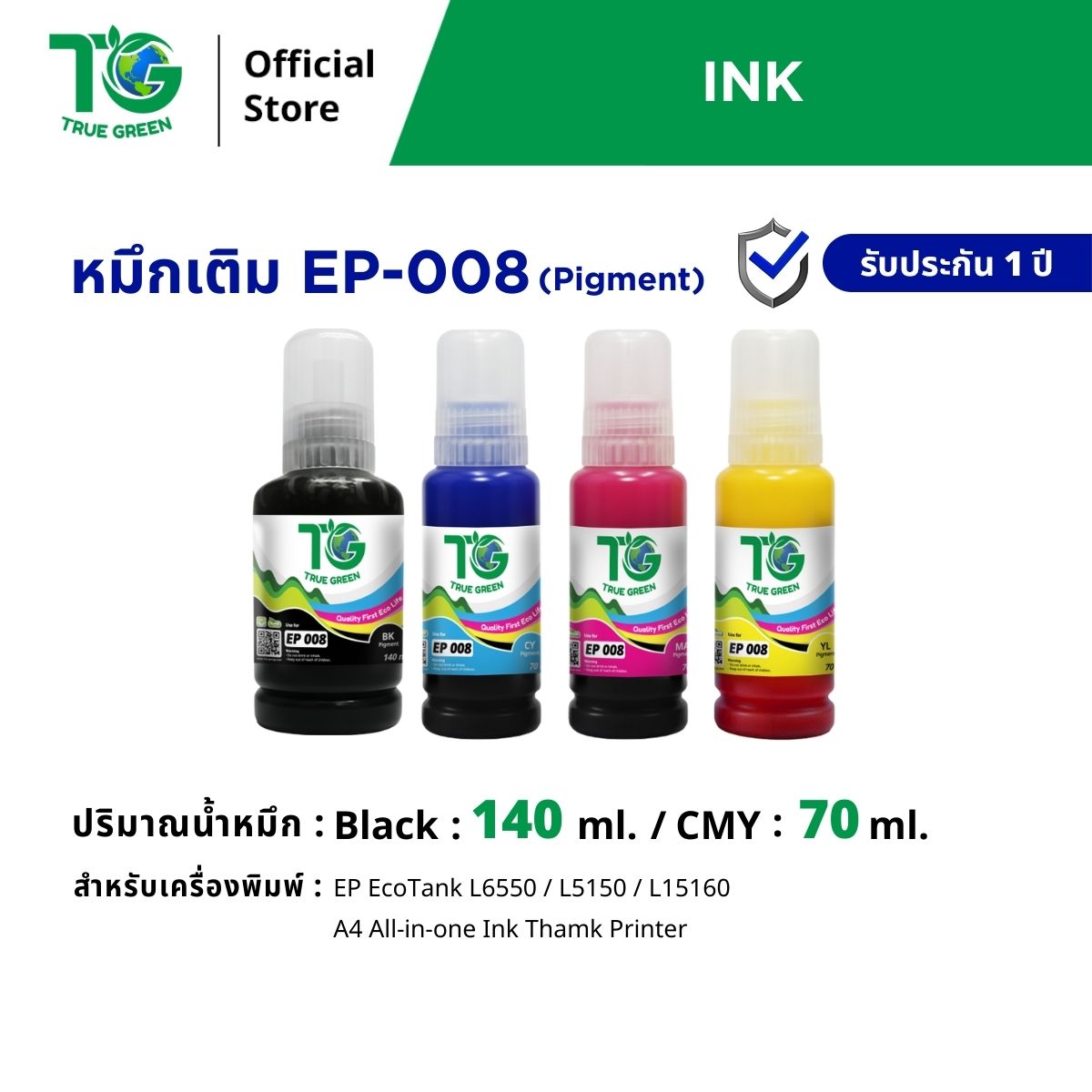● EP-008 หมึกเติม สำหรับ เครื่องปริ้น Epson EcoTank L6550,L6580,L15150,L15160 A4 All-in-One Ink Tank Printer ● ให้งานพิมพ์ประสิทธิภาพสูง คุ้มค่าและประหยัดค่าใช้จ่าย ● สินค้าที่จะได้รับ หมึก จำนวน 1 ชุด ● สีดำ/Black จำนวน 1 ขวด ขนาด 140 ml. Pigment (หมึกกันน้ำ) ● สีฟ้า/Cyan จำนวน 1 ขวด ขนาด 70ml. Pigment (หมึกกันน้ำ) ● สีม่วงแดง/Magenta จำนวน 1 ขวด ขนาด 70ml. Pigment (หมึกกันน้ำ) ● สีเหลือง/Yellow จำนวน 1 ขวด ขนาด 70ml. Pigment (หมึกกันน้ำ) ● ยี่ห้อ True Green